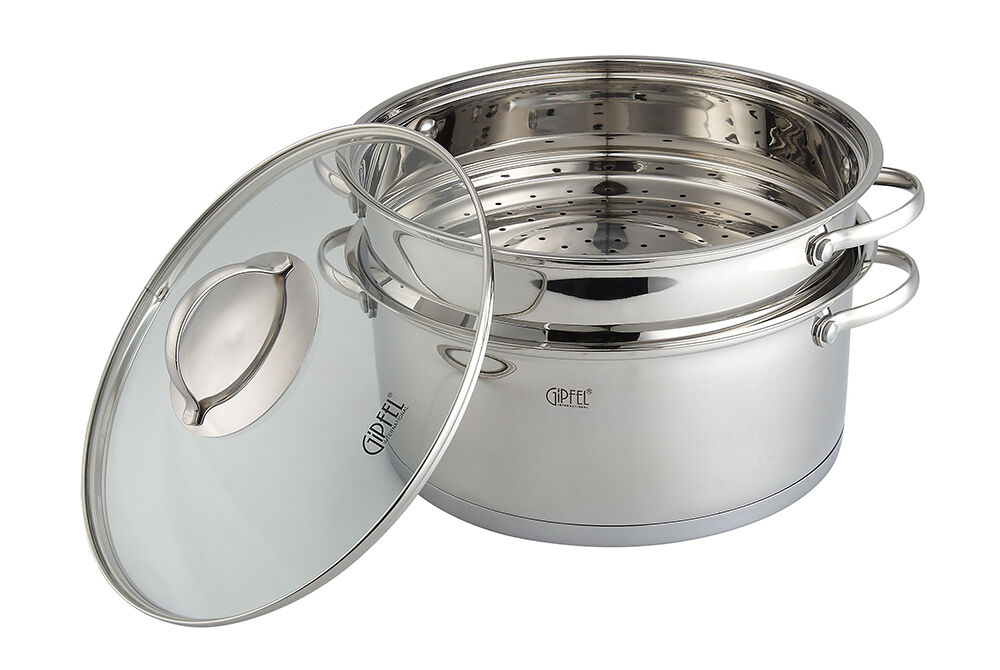 Le modèle en acier inoxydable du fabricant allemand se compose d'un bac à chaudière et de trois étages. Son volume total est de 11 litres, son diamètre est de 32 cm.Le cuiseur vapeur a un couvercle en verre résistant à la chaleur avec un trou pour que la vapeur s'échappe. Le cuiseur vapeur est fabriqué dans un design moderne laconique qui s'intègre dans n'importe quel style de cuisine, la taille n'est pas frappante.