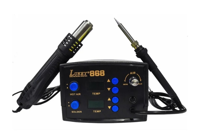 Ce modèle est une station de soudage. Il y a un indicateur numérique qui contrôle la température. L'équipement à deux canaux de l'appareil se compose d'une alimentation et d'un fer à souder, qui a un sèche-cheveux et diverses buses.