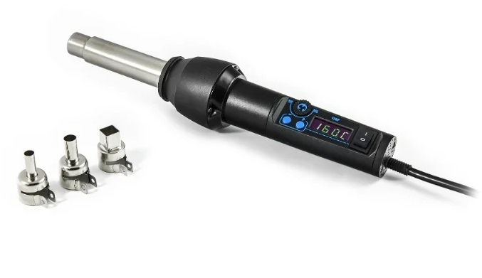 Ce modèle est un pistolet à air chaud contrôlé par un microprocesseur. Il convient au démontage et au montage de composants électroniques, à l'installation d'un tube thermorétractable, ainsi qu'au soudage de pièces en plastique et bien plus encore.
