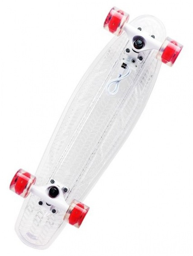 Ce skateboard atypique intéressera aussi bien les "grandes" filles que les "petites". Sa principale caractéristique est la présence d'un rétroéclairage LED (avec plusieurs modes), qui est chargé par un câble USB. Des roues en polyuréthane et des roulements de haute qualité permettent de tirer le meilleur parti de la conduite.Les joints et les défauts de la surface de la route ne sont presque pas ressentis pendant la conduite. Les bagues (élastiques d'étanchéité) sont en polyuréthane avec un degré de rigidité moyen, ce qui facilite le contrôle du croiseur.