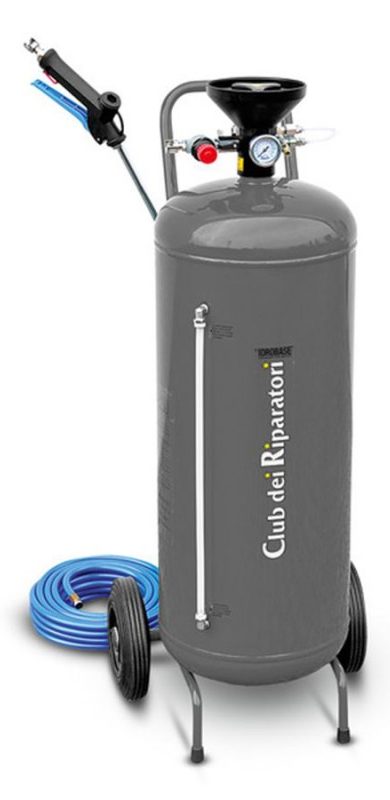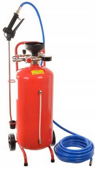 Fabriqué en acier inoxydable. Le volume du réservoir d'eau est de 50 litres, ce qui est suffisant pour laver plusieurs voitures. Pour que le produit fonctionne, il est nécessaire d'utiliser un compresseur.Il est nécessaire de verser de l'eau avec du détergent dans l'appareil, de la mousse se forme sous l'influence de l'air.
