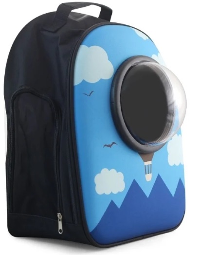 Aucun connaisseur de choses stylées et originales ne passera devant un tel sac de transport. Le sac à dos a une impression inhabituelle en forme de ballon sur le devant, ainsi qu'une fenêtre en forme de hublot volumineux, d'où votre petit ami peut regarder ce qui se passe autour.