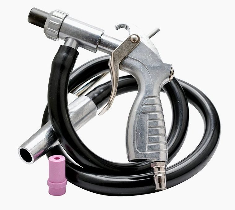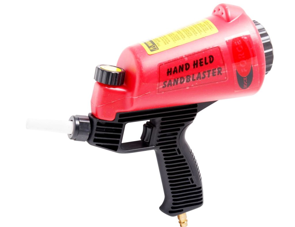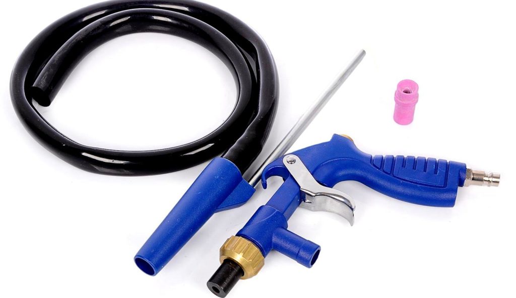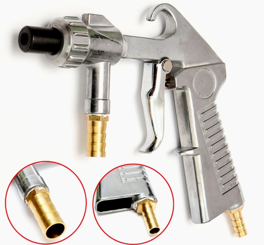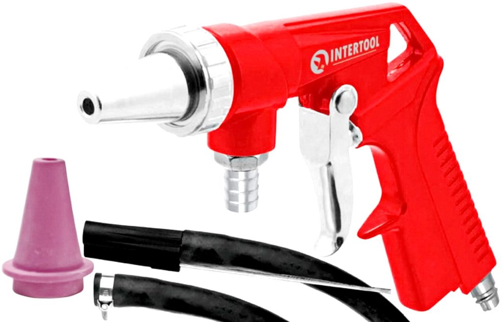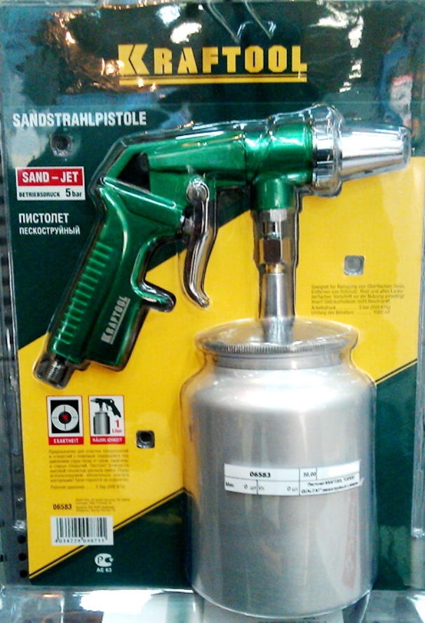 Les produits sont fabriqués en Chine. La principale différence est le manque de capacité. L'abrasif est fourni par le tuyau fourni avec le kit. Il est immergé dans un récipient de sable, après quoi le pistolet est connecté au compresseur. Malgré son faible coût, le produit est assez fonctionnel et vous permet de traiter des surfaces importantes.