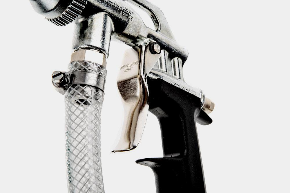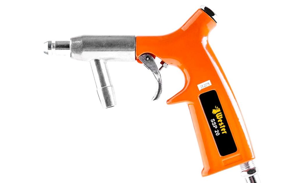Le constructeur a mis l'accent sur un corps entièrement métallique recouvert de caoutchouc, ce qui augmente considérablement son ergonomie. Il y a un récipient inférieur pour l'abrasif. La gâchette est pressée avec deux doigts.Grâce au limiteur en saillie sur la poignée, il n'y a pratiquement aucune possibilité de pincer les doigts libres restants.