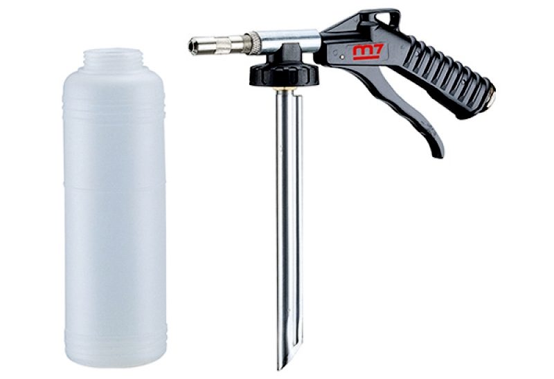 Le réservoir est en aluminium, ce qui évite ses dommages mécaniques lors de la chute. Poids du produit - 920 grammes, consommation d'air - 500 l / min. Pour un fonctionnement efficace, il vaut la peine de connecter un compresseur puissant à l'appareil. La présence d'un crochet au dos permet de se libérer rapidement les mains.