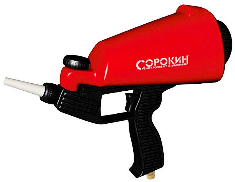 L'une des marques d'auteur les plus populaires en Russie. L'ingénieur Sorokin est l'auteur d'un grand nombre d'équipements spéciaux, dont des pistolets de sablage reliés au compresseur. Le modèle diffère en ce qu'il est produit avec un réservoir supérieur pour abrasif, ce qui rend son travail plus pratique et simple. Réservoir d'une capacité de 0,9 litre. Conçu pour le nettoyage de petites surfaces. Il est particulièrement populaire auprès des artisans à domicile.
