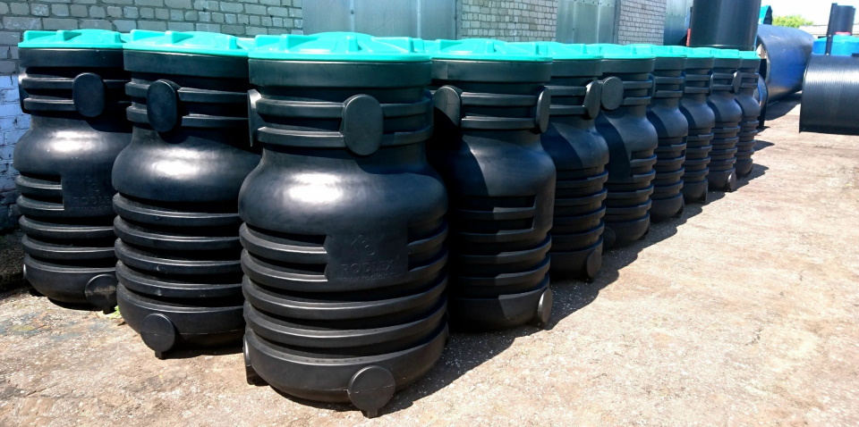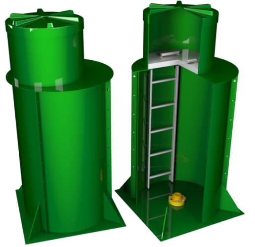 Les caissons GRINLOS sont de forme cylindrique en polypropylène, dont l'épaisseur est de 8-12 mm. Le bas de la structure est en outre renforcé par une plaque en polypropylène. Le caisson est absolument hermétique, étanche à l'air et à l'eau, ce qui a été réalisé grâce à la technologie de soudage unique. Des nervures de raidissement sont prévues pour empêcher la déformation du récipient. Selon le modèle, la chambre de travail est livrée avec ou sans col.Il y a des pattes sur la base, il y a une échelle antidérapante intégrée, un couvercle.