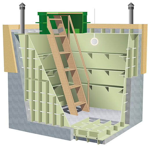Le corps soudé a des parois de 1,0 à 1,5 cm d'épaisseur avec de solides raidisseurs en plastique qui ne nécessitent pas de renforcement supplémentaire. Le forfait comprend une trappe scellée, des étagères en polypropylène, un tuyau de ventilation. Le fond est fait de renfort. Une entrée pour le câble d'alimentation a été installée.La montée et la descente en toute sécurité sont assurées par une échelle en bois confortable. Les dimensions peuvent être très diverses (Lxl) : 1,2... 6,0 x 1,5... 2,4 avec une hauteur de 2 mètres.