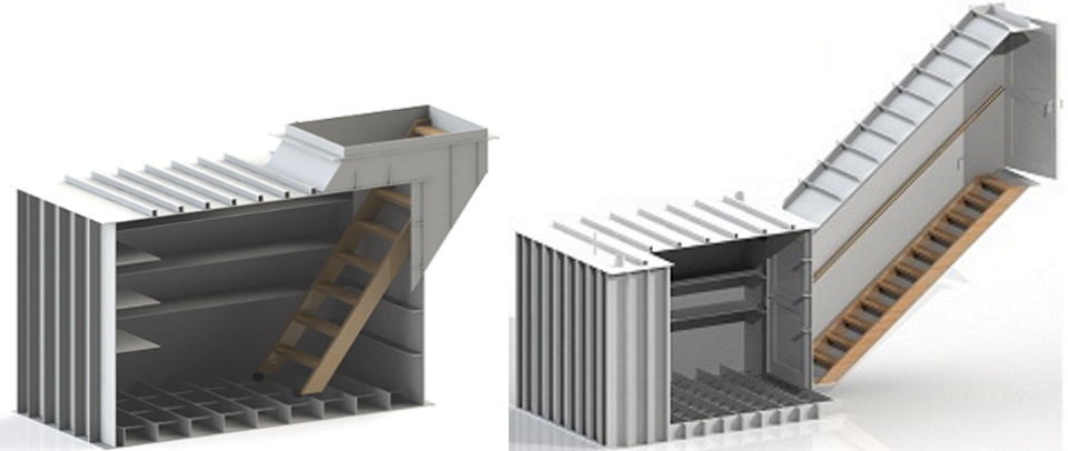 Il y a sept caissons dans la gamme de modèles, qui diffèrent par leur taille. Dans cinq produits, l'entrée se fait par le haut, dans deux - par le côté. Vous pouvez descendre l'échelle. Le plus grand modèle a un escalier fixe plus plat. Garantie - 5 ans.