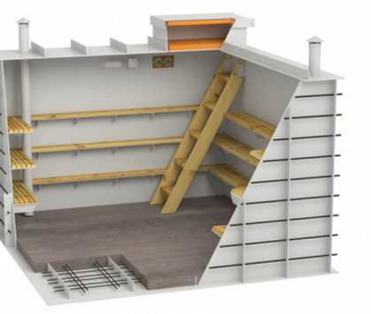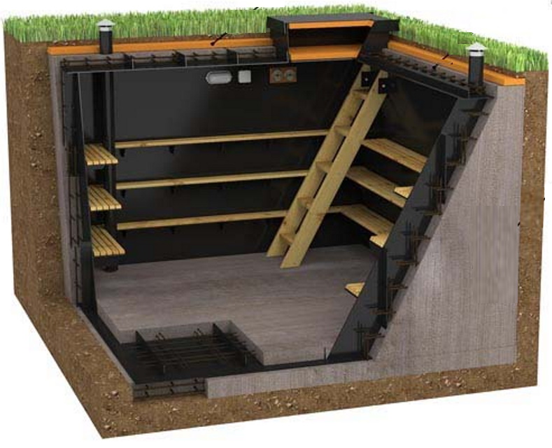 La cave GRINLOS est un local technique hermétique de forme cubique à entrée verticale. Le volume de l'espace intérieur dépend des dimensions du modèle sélectionné. À l'intérieur, il y a des étagères solides pour stocker le contenu, le stockage des aliments toute l'année, un escalier et un système d'éclairage.