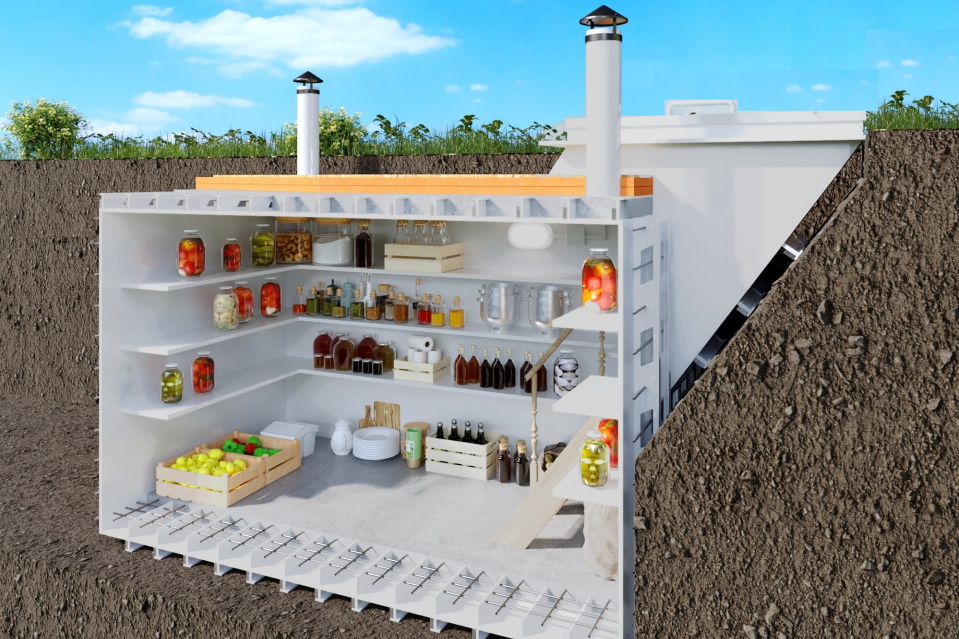 La gamme de produits comprend quatre modèles de modules souterrains pour créer un sous-sol multifonctionnel, ne différant que par la taille. Pour la fabrication des réservoirs, on utilise des feuilles de polypropylène de qualité alimentaire d'une épaisseur de 0,8 à 1,2 cm.Des raidisseurs en forme de V sont soudés sur le toit et les côtés de la structure pour augmenter la résistance et éviter la compression sur les sols limoneux et sableux. La descente dans la cave s'effectue par le col par le haut. L'équipement de base comprend uniquement un couvercle sans isolation, une ventilation par gravité et des supports d'étagère.De plus, il doit être équipé d'une ventilation forcée et naturelle, d'un escalier confortable, d'étagères, d'un couvercle avec isolation, ainsi que d'un éclairage.