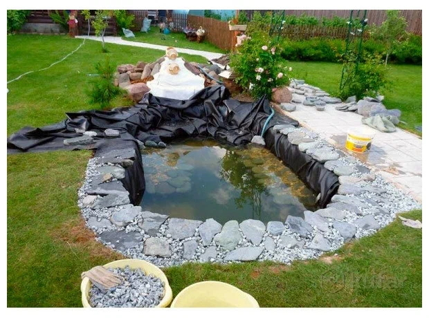 La flexibilité du matériau vous permet de répéter n'importe quelle forme de l'étang. Bien adapté pour créer de grands bassins profonds. Il ne se déchire pas lorsque le sol est déplacé et s'adapte parfaitement aux parois de la fosse. Mais ce sera également une excellente option pour les petits étangs.
