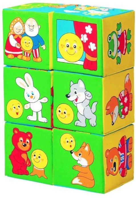 Des cubes textiles de taille assez grande, avec un côté de 10 cm, avec des scènes lumineuses de leurs contes de fées préférés sur les petits pains, les navets et les tours ne laisseront pas les enfants indifférents. Ils sont absolument sûrs, et même s'ils se cassent, le remplisseur de hollowfiber ne causera aucun dommage aux miettes.