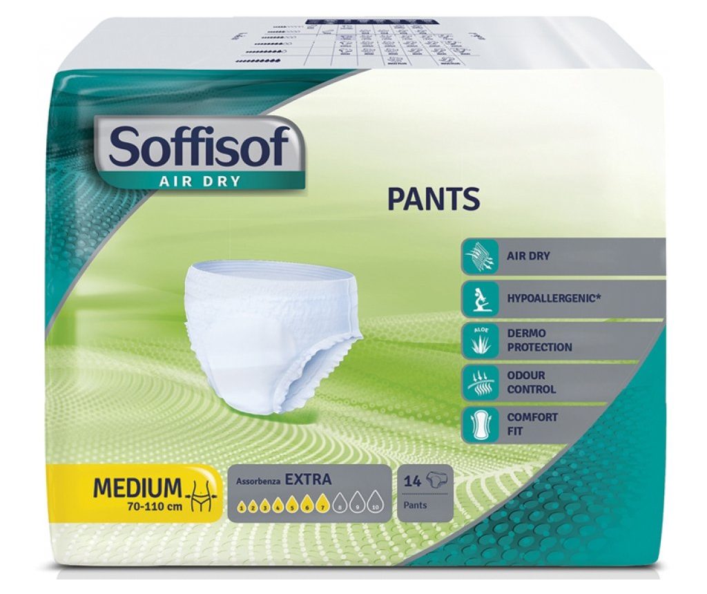 Pour les personnes mobiles, nous recommandons le pantalon absorbant Soffisof Air Dry. Ils sont idéaux pour les patients souffrant d'incontinence légère à modérée. Le produit est facile à porter comme un sous-vêtement normal, équipé d'une bande élastique ergonomique pour un maximum de confort et une plus grande résistance à l'usure. La housse extérieure est en tissu doux et respirant qui permet à la peau de respirer.