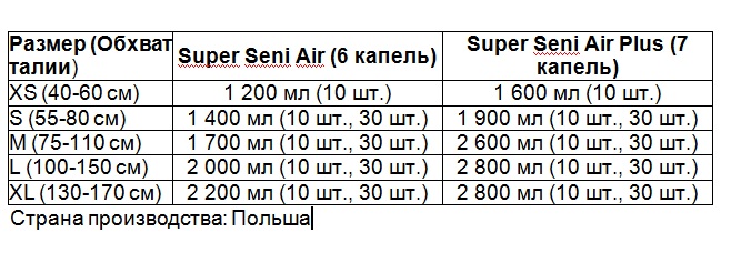 La société polonaise SENI propose 5 tailles principales pour adultes :
