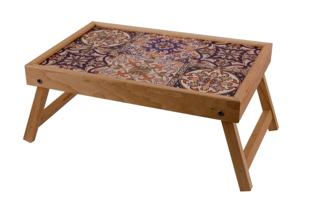 La solution cadeau parfaite : un plateau à pieds pliants, se transformant en une table compacte, sera un véritable compliment pour les amis et les proches. Il est utile pour traiter les invités avec des boissons, des fruits et pour les petits déjeuners au lit. Des tables en hêtre, décorées d'un design original, ajouteront un zeste incroyable à la vie de tous les jours. La surface du luminaire donne l'atmosphère chaleureuse habituelle de splendeur et d'oisiveté.