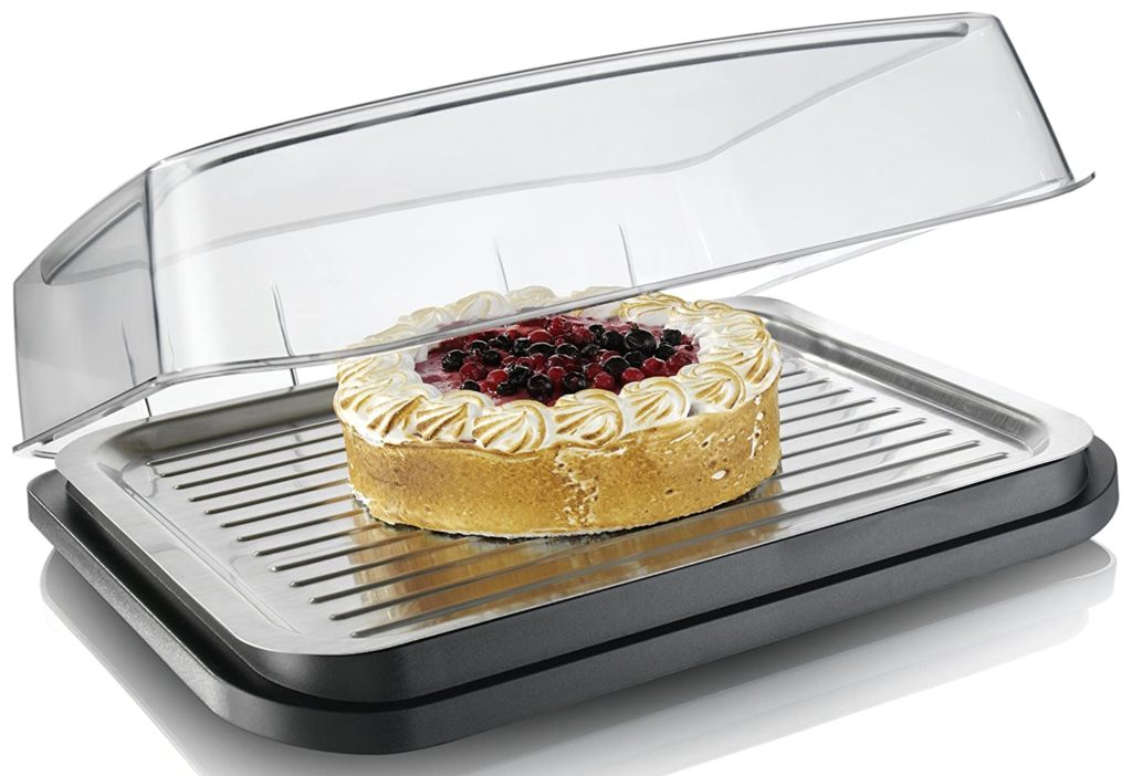 L'acier inoxydable dont le plateau est fait permet l'affichage des aliments directement sur la surface.Le kit comprend un élément spécial qui garde au frais pendant plusieurs heures. Si l'entretoise n'est pas utilisée, l'accumulateur de froid doit être conservé au congélateur.