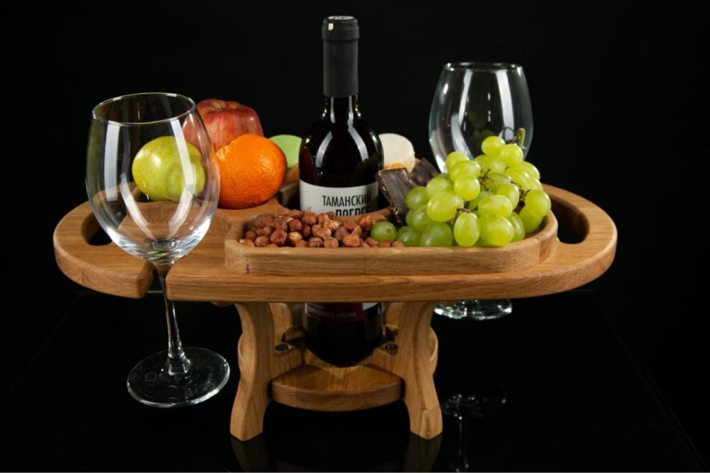 Les verres et une bouteille de vin sont solidement installés dans des fentes et des trous spéciaux en raison de la conception réfléchie de la table. Des collations peuvent être placées au milieu. Matériau naturel - pin, permet de disposer les fruits directement sur un support recouvert de vernis foncé.