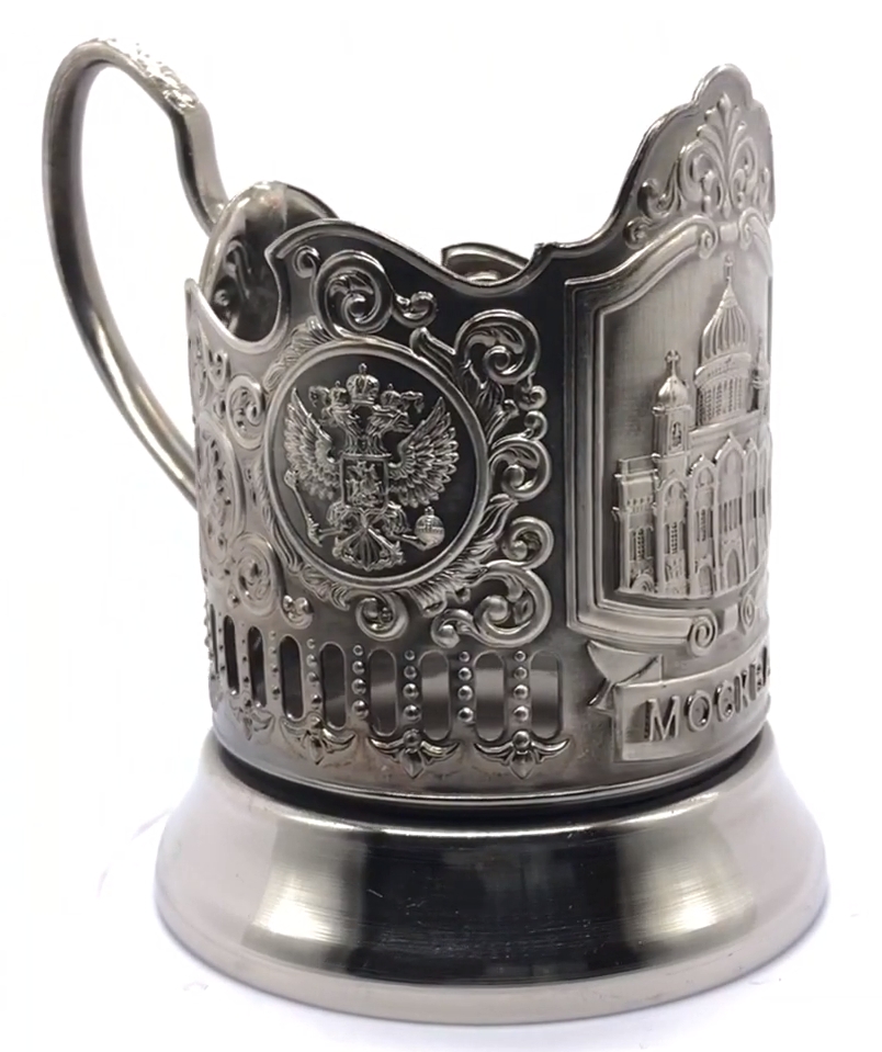 Le modèle est fini avec des monogrammes ornés, a des bords sculptés attrayants, en passant, il y a un support doré incurvé, qui souligne l'aspect général non trivial du support. De plus, l'ensemble contient une élégante cuillère à café dorée et, bien sûr, un verre en cristal. Tous les éléments de l'ensemble sont fabriqués dans le même style, de très haute qualité et hautement artistiques, se complétant esthétiquement. On peut résumer que ce modèle sera un excellent cadeau pour la mémoire de Moscou.