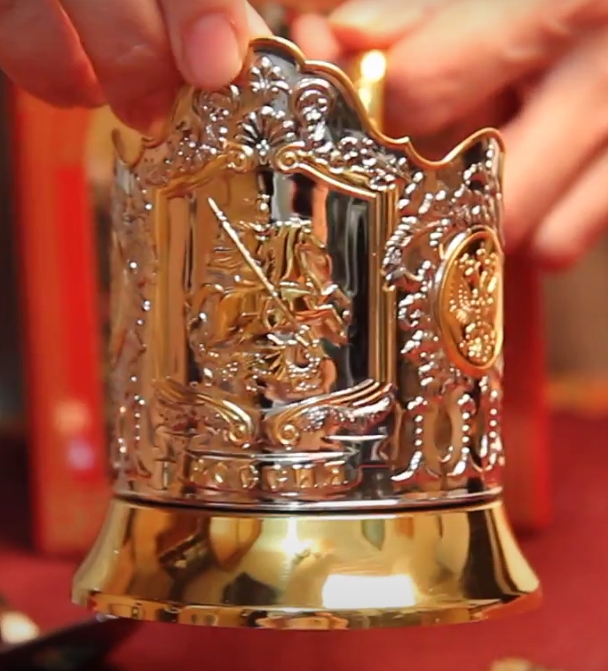 Bronze au service à thé doré, où l'on voit le célèbre George le Victorieux. Le saint des guerres, qui a longtemps été considéré comme le saint patron de la capitale, est traditionnellement représenté à cheval, frappant un serpent avec une lance, son image est décorée de métal précieux à la main. Ci-dessous, nous voyons l'inscription "Moscou", en général, le produit a l'air majestueux, et la présence de symboles d'État des deux côtés du grand martyr en fait un excellent cadeau dans le style officiel.