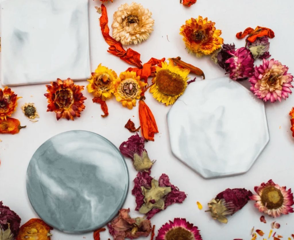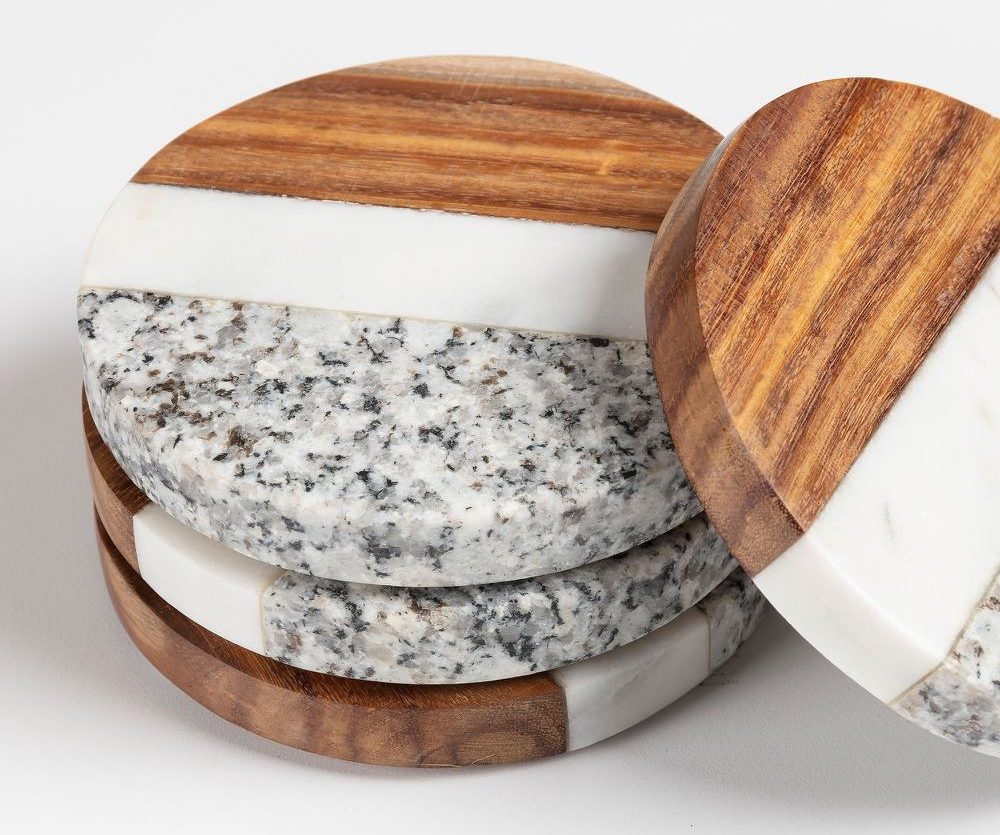 Les accessoires en céramique pour le chaud et le froid sont fabriqués dans des couleurs de marbre. L'ensemble comprend 4 produits de formes différentes : un carré, un rond et deux sous-verres hexagonaux.