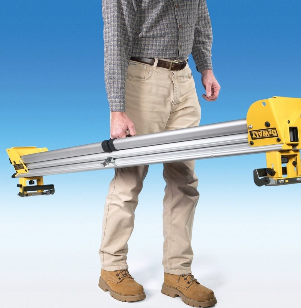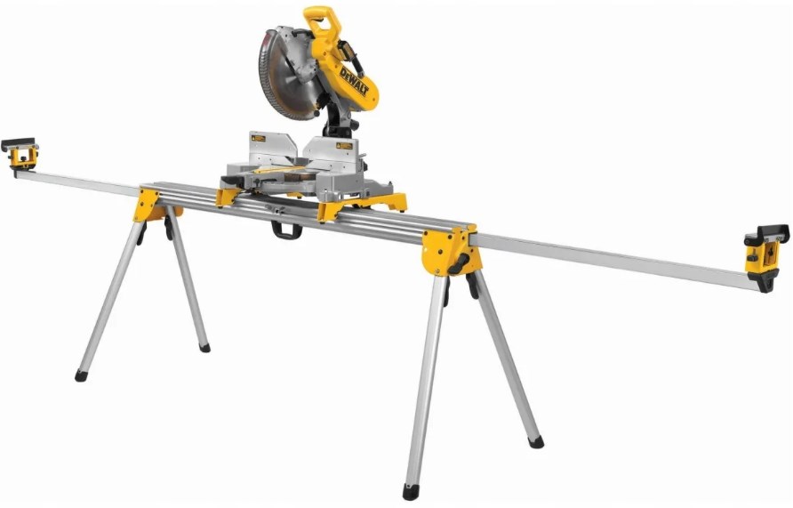 Le modèle de la célèbre marque américaine DeWalt est un support universel pour différents types de scies à onglets. Mais surtout, il convient au travail avec du bois long. Cela est dû à la grande longueur avec les étagères dépliées - 383,5 cm.La construction métallique fiable du lit peut supporter des charges allant jusqu'à 227 kg.