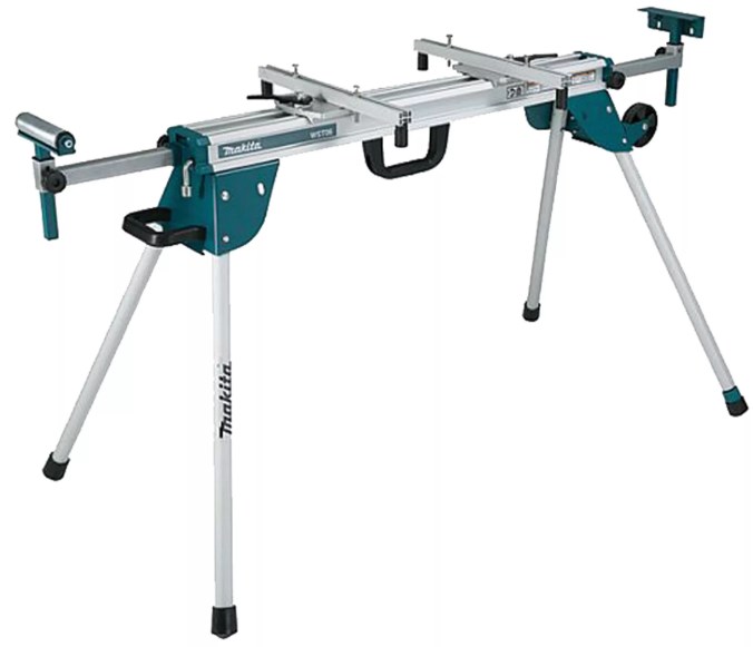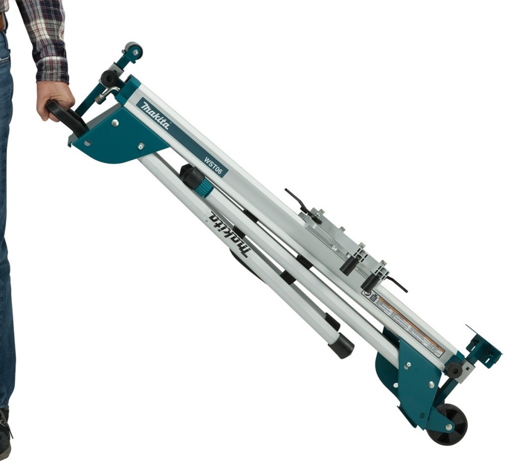 Support de scie fonctionnel de Makita. Comme tous les produits de cette société japonaise, ce modèle se distingue par un assemblage de haute qualité, une attention aux détails et une réflexion.Le fabricant a prévu la possibilité de le plier en un chariot pratique pour transporter toute la structure sans démonter la scie. Pour plus de commodité et de rapidité de déploiement, la table est équipée d'un mécanisme à ressort.