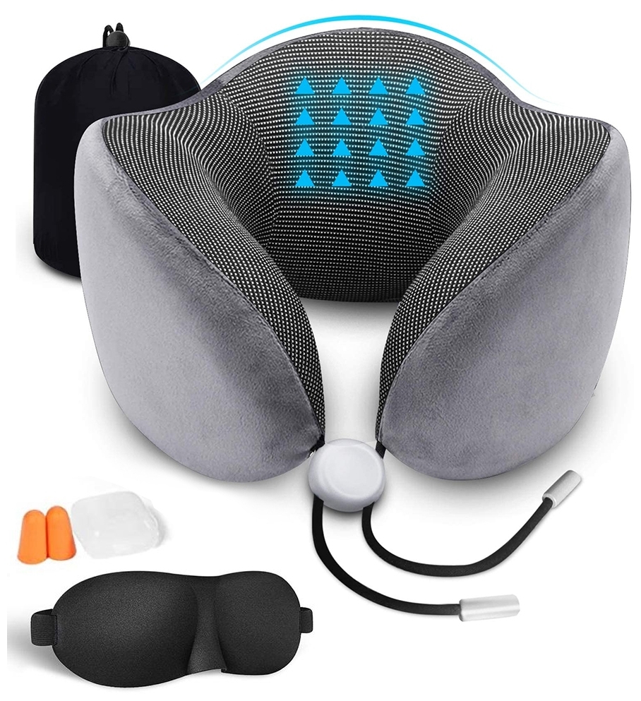 L'oreiller élégant et multifonctionnel en mousse à mémoire de forme soutient non seulement le cou et soulage les tensions, mais améliore également la circulation sanguine. En plus de l'oreiller, le kit comprend un masque, une housse et des bouchons d'oreilles. Par conséquent, le reste sera aussi confortable que possible.