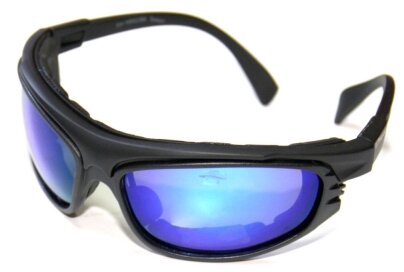 Différence dans le design moderne. Corps large en plastique noir. Les bras sont longs, fins. La face interne au-dessus des yeux est une doublure douce. Il existe trois options d'objectifs interchangeables : gris, marron, bleu.