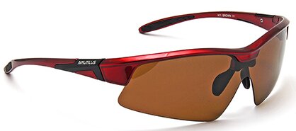 Elles se distinguent par des montures semi-cerclées et des verres marron. Les cadres sont surlignés en rouge avec des inserts noirs, des lettres de logo blanches sur la face supérieure des côtés. Il existe des plaquettes de nez en silicone souple.