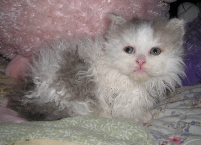 Des chats étonnants sont élevés à la suite du croisement de Munchkins et de LaPerms. Des ancêtres, les espèces résultantes ont hérité de pattes courtes et de cheveux bouclés. Parfois, ils sont appelés "agneau de chat". La symbiose des deux races a donné un excellent résultat. Il s'est avéré des spécimens intéressants avec des cheveux longs et ondulés. Le poids corporel moyen des chats varie de 2,2 à 4 kg, les femelles pèsent de 1,8 à 3,6 kg.