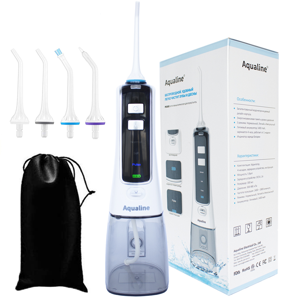 Aqualine pd300 est un appareil universel adapté non seulement aux adultes mais aussi aux enfants. Adapté au nettoyage de la langue et des gencives, il peut être utilisé pour les couronnes, les implants, les accolades, les ponts, les accolades et autres appareils spécifiques. Il y a un indicateur de batterie. Le kit comprend 4 buses et un étui de rangement pratique. Il y a un mode de massage des gencives. Pression maximale du jet 900 kPa. Prix : 2890 roubles.