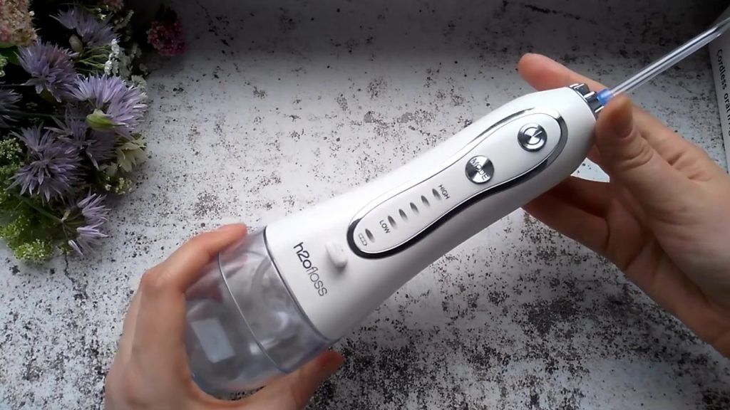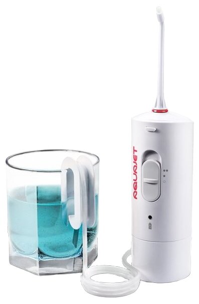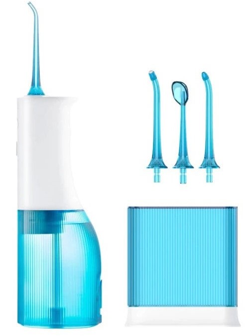 Irrigateur portable, a de petites dimensions : 3x3,50x24 cm, et un poids léger, seulement 250 gr. Ensemble complet : cartouches de fil dentaire - 3 pièces, gratte-langue, tuyau de voyage avec clip, boîte en plastique, adaptateur USB et secteur. L'ensemble comprend 2 embouts amovibles : un embout-brosse et un pour le nettoyage au jet. Coût moyen : 7800 roubles.