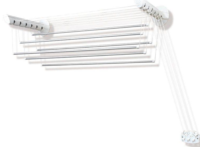 Conception semi-automatique Wellex CH4200, avec laquelle vous pouvez facilement et rapidement abaisser ou élever la flèche au niveau souhaité. Le modèle est fixé au plafond, ce qui permet de les placer dans des pièces de toutes tailles. Ils sont fabriqués à partir de matériaux durables résistants à l'humidité et aux températures extrêmes. La conception a des poutres amovibles et inclinables, ce qui vous permet de sécher des vêtements de différentes tailles.