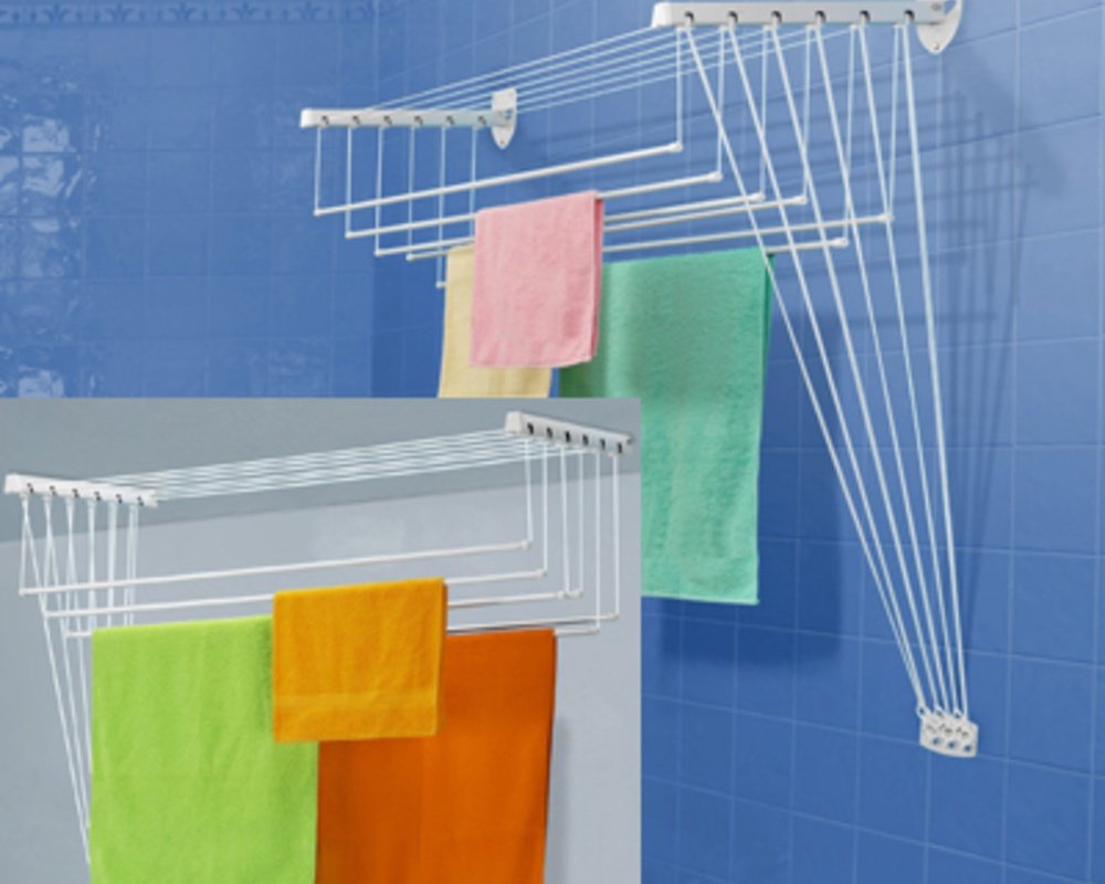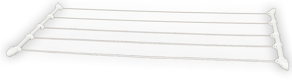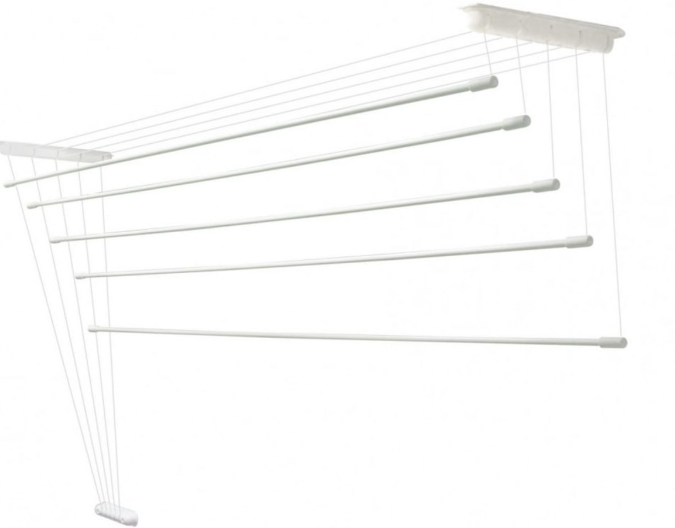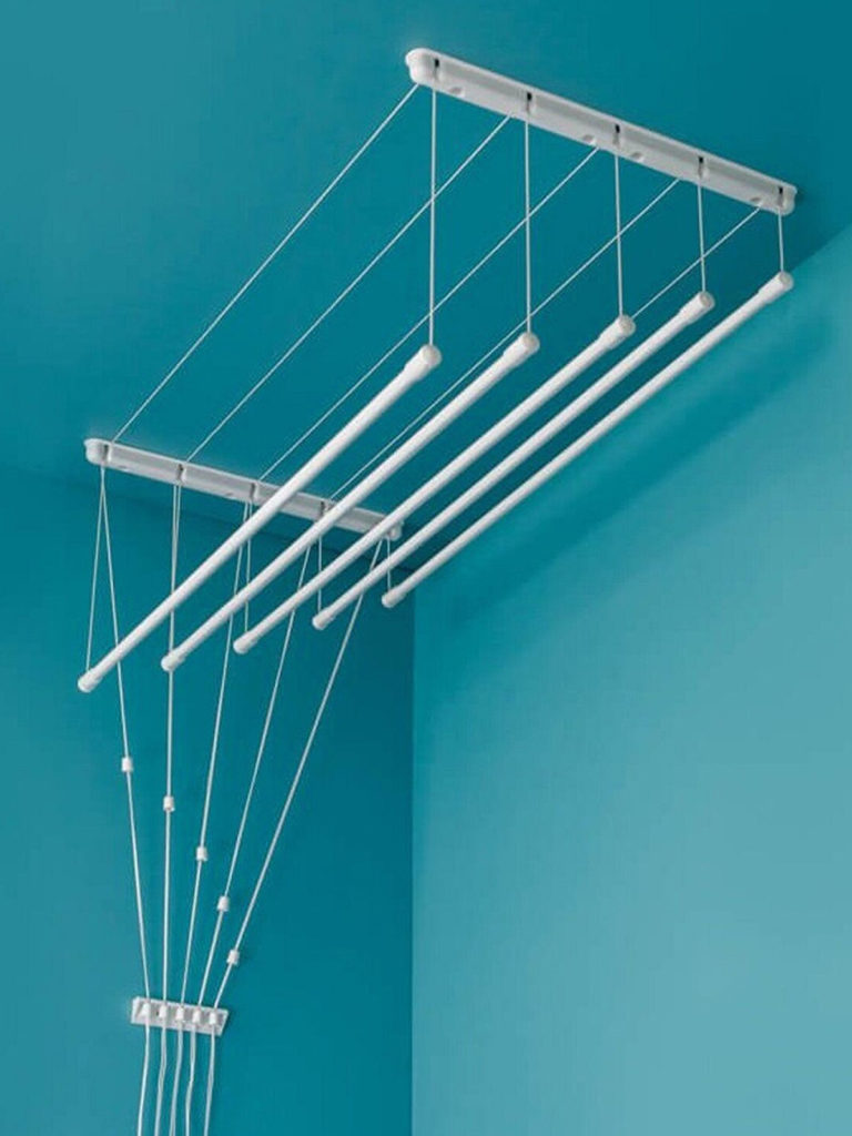 Le modèle de corde de fabrication russe a un design horizontal familier. Vous pouvez le fixer non seulement au plafond, mais également aux murs. Cinq cordes sont fixées entre deux lattes en plastique pour ranger les choses. Ce produit ne convient que pour de petites quantités de linge de petite taille. Idéal pour sécher les serviettes, les écharpes, les vêtements des enfants. Souvent utilisé dans les petites salles de bains et les chalets.