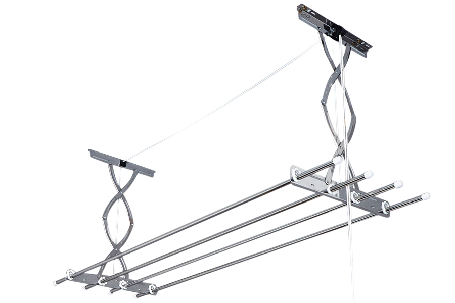 Ce type de séchoir est plus spacieux et durable. La base de la structure est constituée de deux poutres métalliques fixées au plafond à plusieurs endroits. Ils tiennent un système de rouleaux à travers lesquels sont passées des cordes de lianes avec des barres transversales aux extrémités. La conception est pratique dans la mesure où chaque rail est indépendant l'un de l'autre et peut supporter un poids allant jusqu'à 3 kg. Le support pour lianes est fixé à proximité, ce qui vous permet d'utiliser facilement la structure et de sélectionner facilement la hauteur des barres transversales.Le système lui-même est fait de métal durable, résistant à la corrosion.