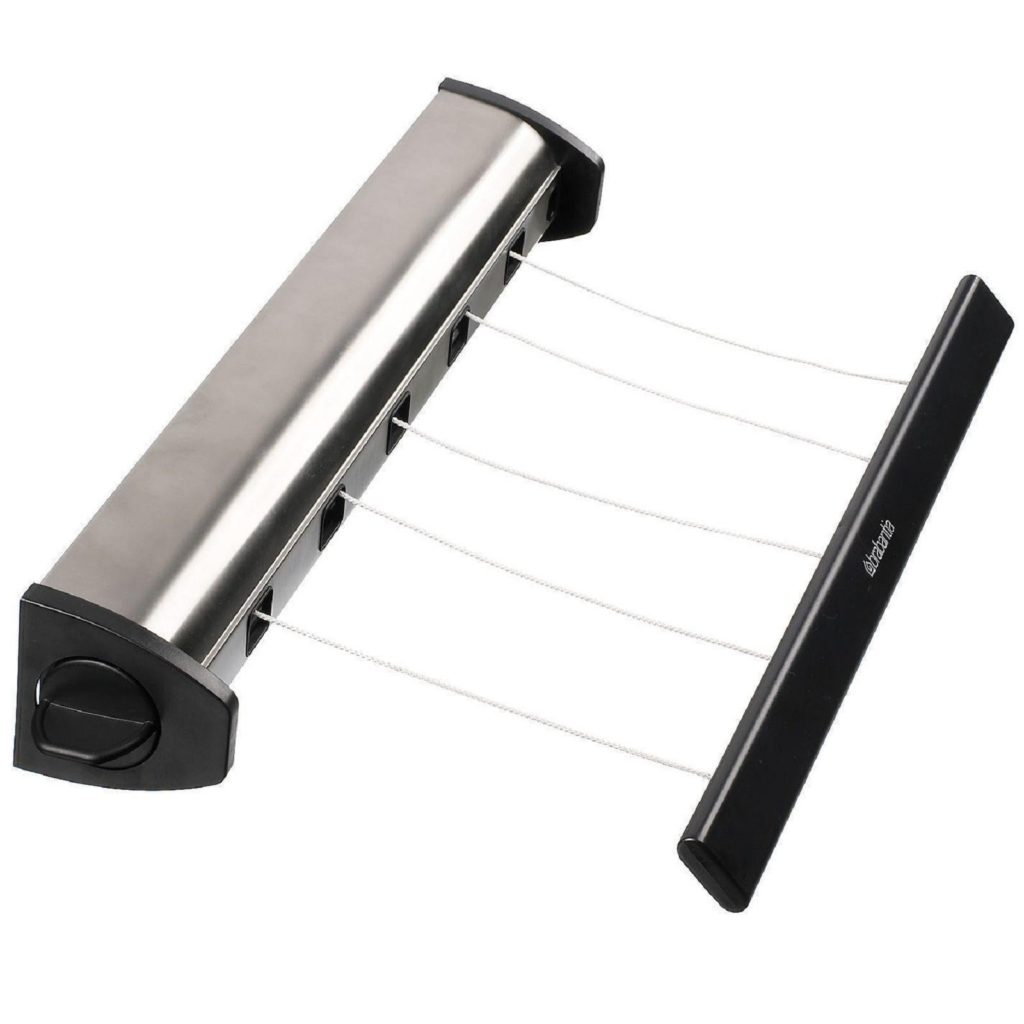 Sèche-linge Brabantia robuste et fiable, monté entre le mur et le plafond. Le corps du produit sous la forme d'un tuyau est en métal et comporte des fentes spéciales à travers lesquelles sortent les cordes. La partie de travail s'étend jusqu'à 4,4 mètres, ce qui vous permet de suspendre les vêtements dans un ordre pratique pour le séchage. Brabantia a un verrou de tension de corde. La charge maximale atteint 12,5 kg.
