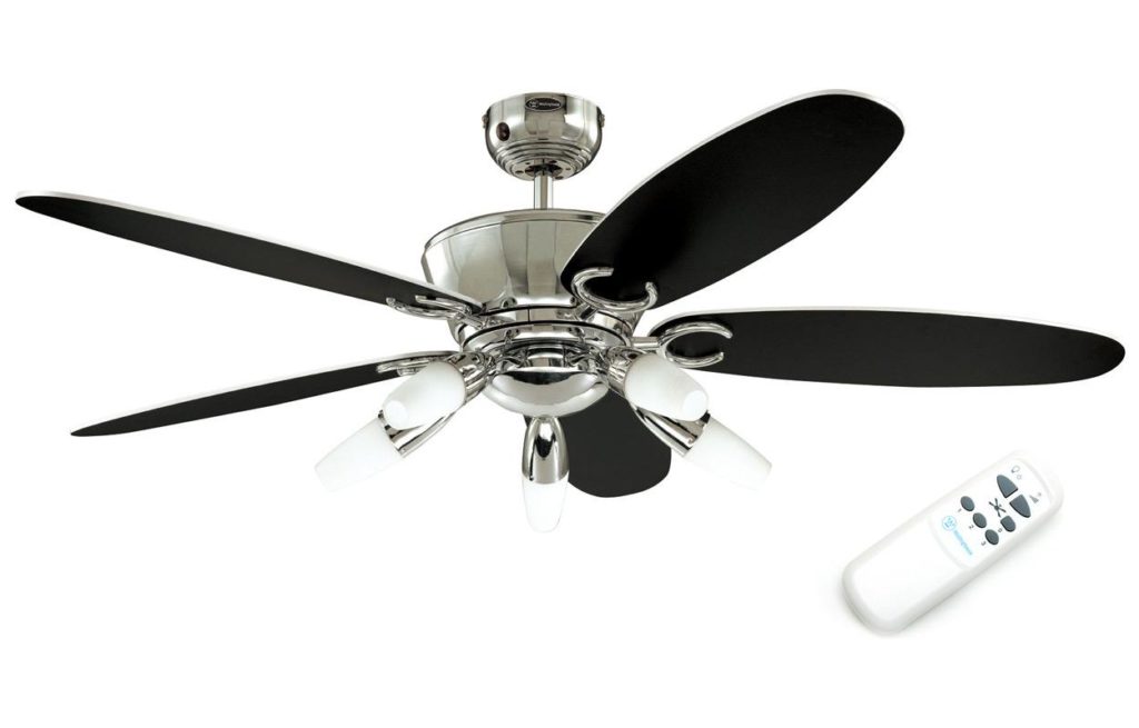 Les designers ont fait un bon travail sur ce modèle, ressemblant à un lustre, lui donnant un aspect élégant qui se combinera parfaitement avec les intérieurs classiques et les styles modernes. Le matériau de la base était du métal additionné de chrome.Pour la fabrication des pales, du MDF dans les tons noir et blanc a été utilisé, à l'abri de l'humidité.