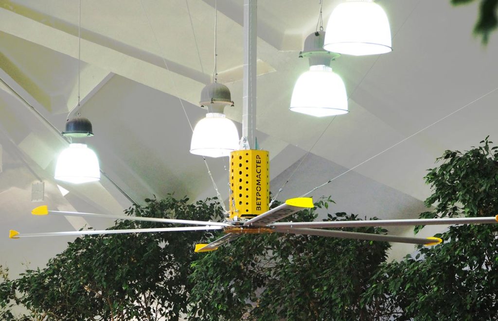 La base de l'appareil est en aluminium et peinte dans des couleurs claires. Ce matériau ne rouille pas, c'est pourquoi les ventilateurs sont souvent montés dans des pièces très humides.Les pales sont courbées à grand angle, ce qui permet de déplacer rapidement des masses d'air à basse vitesse. Le modèle présenté est facile à utiliser. Il s'agit d'une structure de plafond à haute puissance.