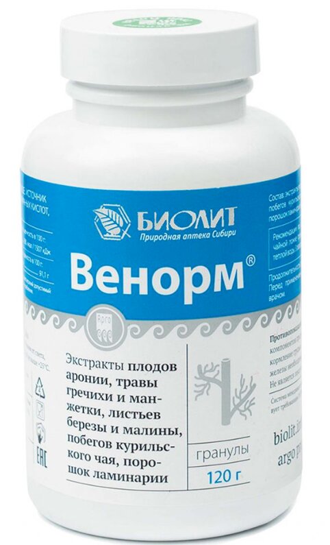Application : ajouter 1 cuillère à café de granulés (5 g) à 100-150 ml d'eau tiède, remuer. Boire 15 à 20 minutes avant les repas, 2 à 3 fois par jour. Le cours est de 3-4 semaines. Vous pouvez répéter plusieurs cours. L'effet maximal est un frottement simultané avec la crème Venorm 3 à 4 fois par jour.
