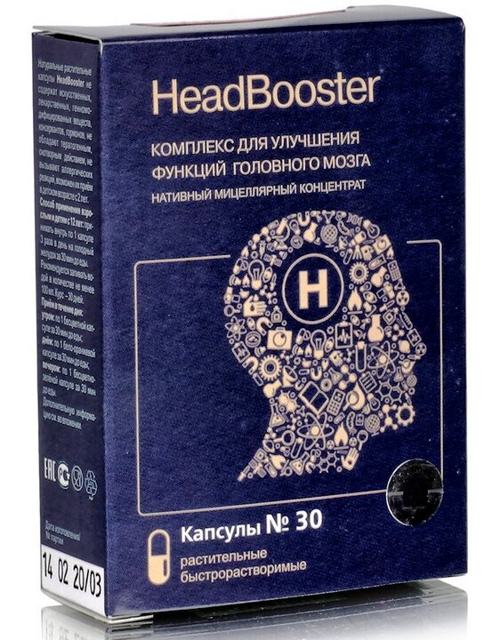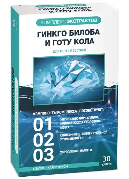 complément alimentaire. Forme de libération - gélules. Vendu dans une boîte en carton blanc. Image bleue, informations sur trois fonctions sur le panneau avant :