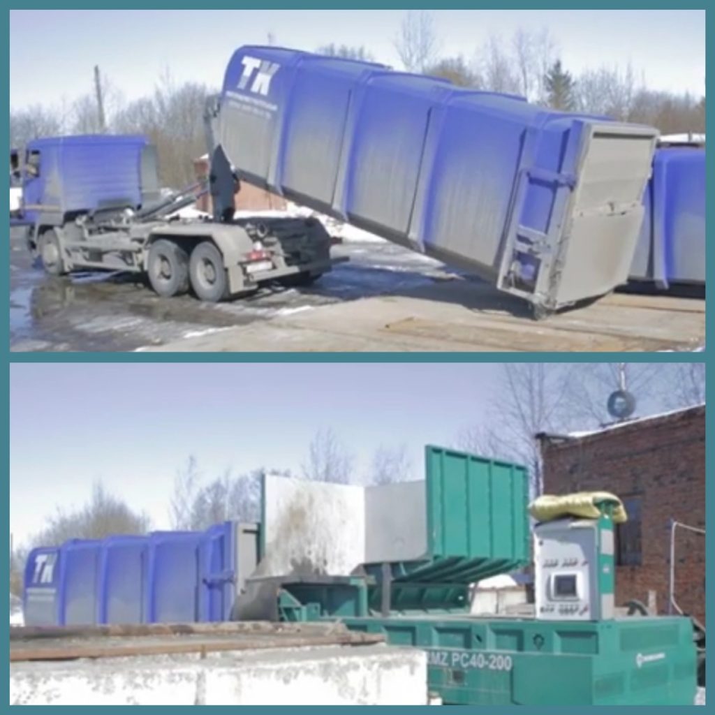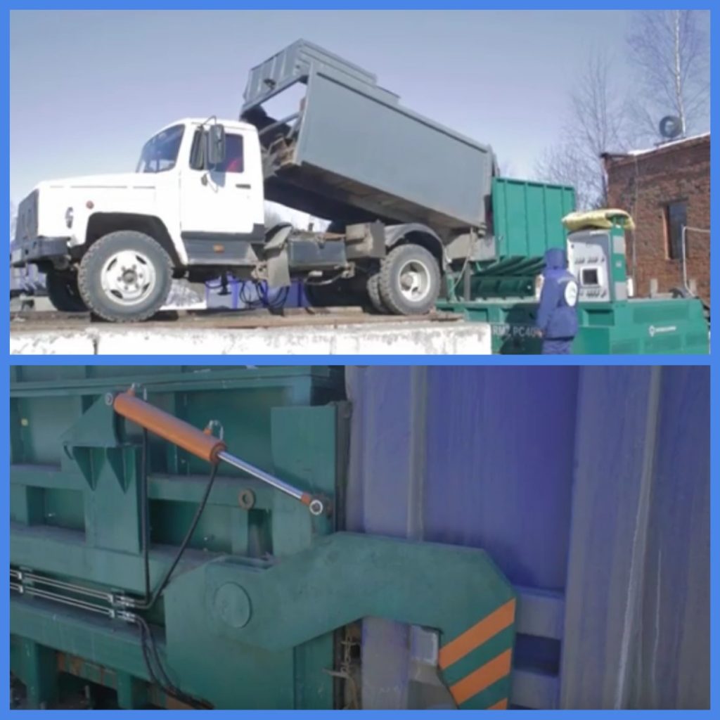 Le compacteur de presse de type mobile de fabrication russe est efficace pour le prétraitement des MSW pendant le transport. Le pressage des matériaux en carton, papier et film se produit avec une diminution de 10 fois.