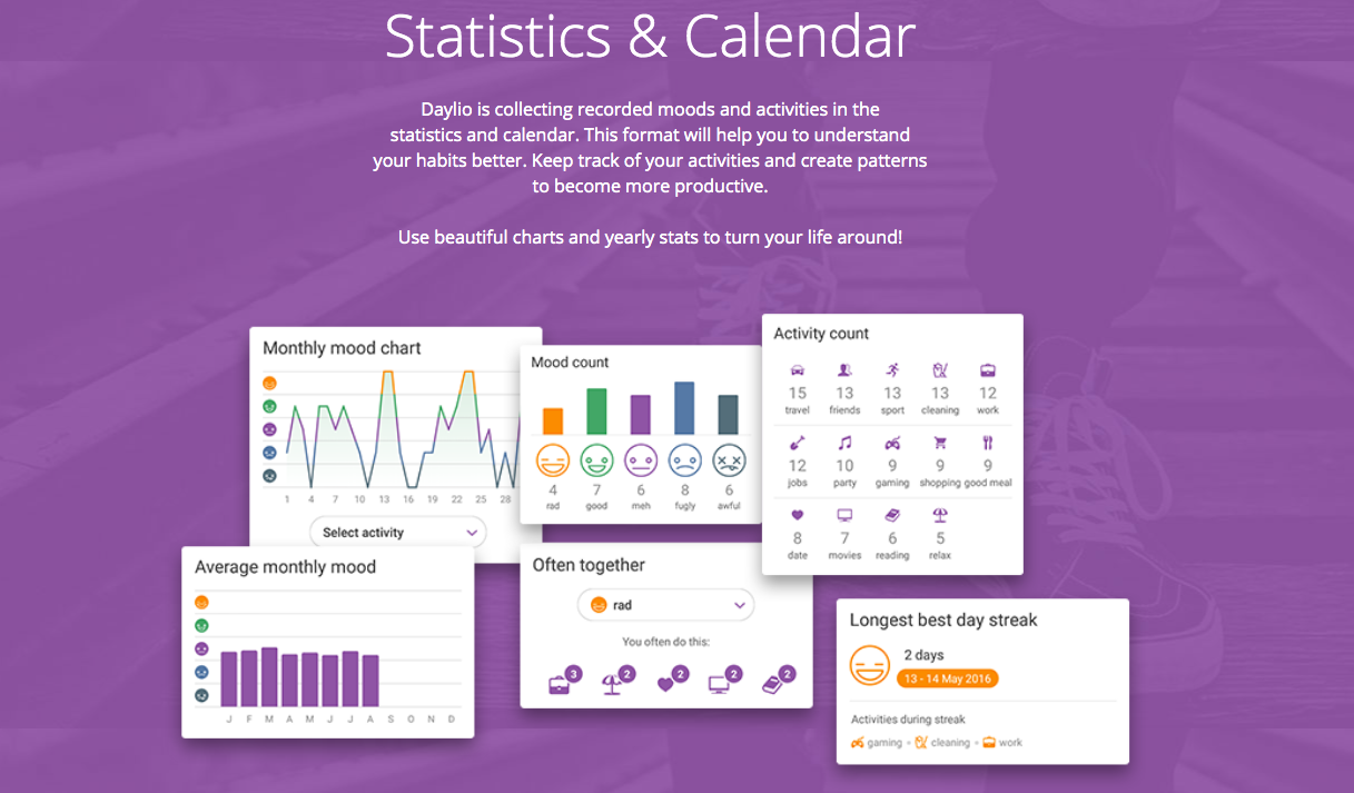 Daylio a été conçu spécifiquement pour que les utilisateurs fassent le point sur leur journée. Publié en russe et en anglais. Les principales tâches sont la collecte quotidienne d'informations, de statistiques et d'un aperçu de l'humeur de l'utilisateur, ainsi que l'établissement de parallèles entre les événements de la journée et l'humeur. En conséquence, l'utilisateur obtient une image générale de son état pour la journée. Travailler avec l'application prend un peu plus d'une minute par jour, il vous suffit d'indiquer l'humeur et l'activité dans lesquelles l'utilisateur était engagé. L'application elle-même est gratuite, mais un abonnement premium est fourni.