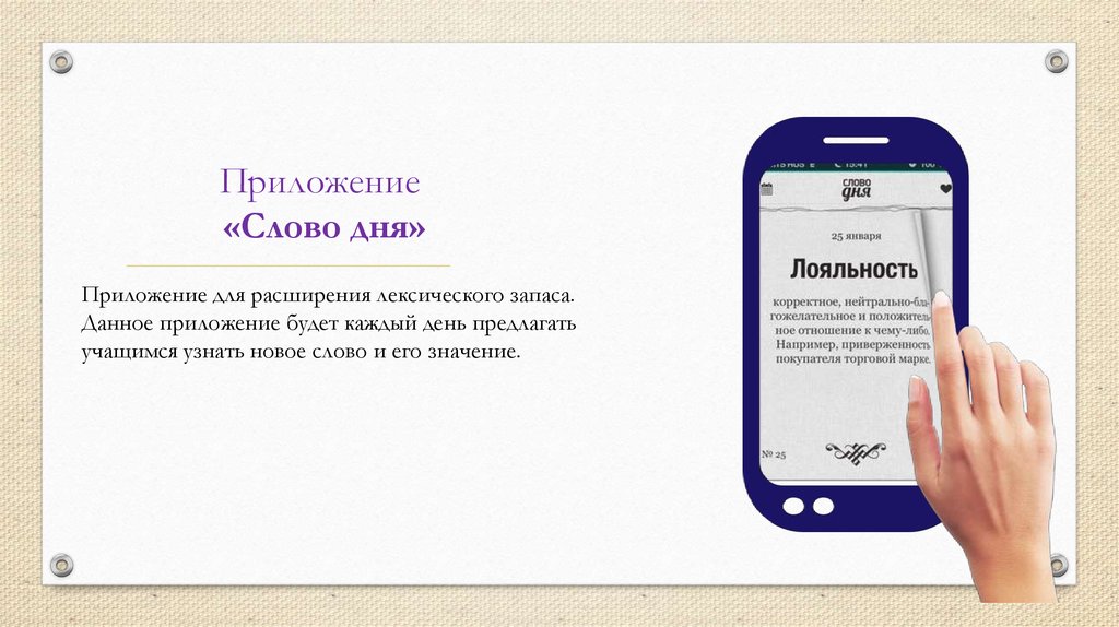 "Word of the Day" est conçu pour ceux qui veulent élargir leur vocabulaire, présenté aux utilisateurs en russe. Le but principal de l'application est de reconstituer le vocabulaire d'une personne. Chaque jour, l'utilisateur est invité à se familiariser avec des mots et des termes rarement entendus dans la vie quotidienne, mais ils sont parfaits pour une utilisation constante dans la communication. Ce contenu a un abonnement payant d'un an.