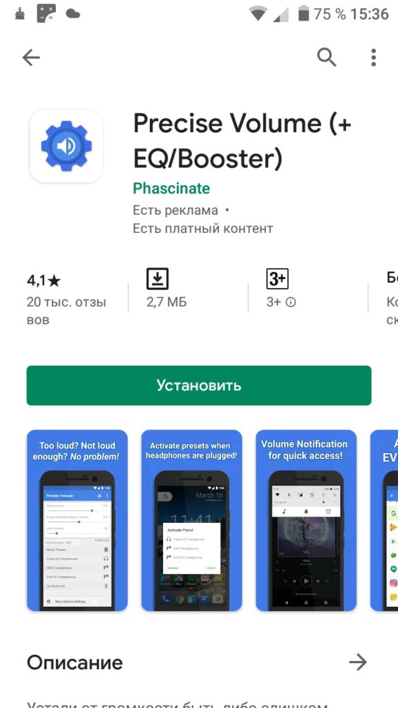 Les paramètres que vous définissez s'appliquent à l'ensemble du système. Ceux. l'amplification du son se produira par rapport à tout son émis par le téléphone. Le principal inconvénient est les publicités constantes en plein écran. Ils incitent littéralement l'utilisateur à évaluer le travail de l'application dans le Play Store. Cela sous-estime grandement l'impression générale d'utilisation et est ennuyeux. Cependant, la fonctionnalité ne peut que se réjouir. Il correspond parfaitement aux caractéristiques déclarées par les développeurs.