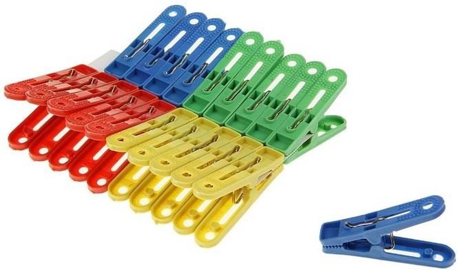 Les clips ont un degré de fixation moyen, fixent solidement tout type de linge, y compris les tissus d'ensemble (plaids, couvertures).Peut être utilisé comme pince à linge dans la salle de bain ou pour sécher les vêtements à l'extérieur. Dans un ensemble de 12 pièces. Livré sans conteneur de stockage. Prix : 214 roubles.