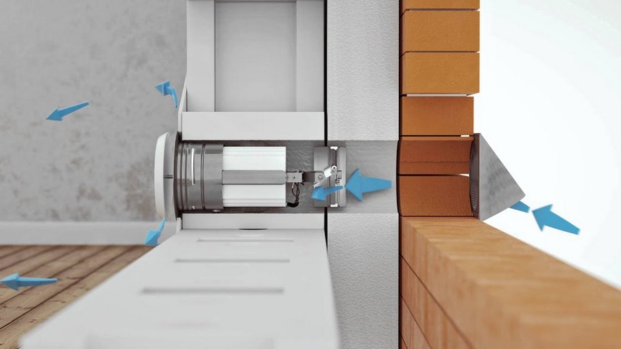 Dans le segment intermédiaire, il est particulièrement populaire vanne d'admission murale, qui s'installe en perçant des trous dans le mur. Ce système a une capacité accrue (jusqu'à 50 mètres cubes par heure). Il existe des modèles équipés d'un filtre qui purifie l'air entrant à un niveau mécanique - ils piègent de petites fractions de poussière et de saleté, d'insectes, de peluches, etc. L'inconvénient peut être que lors d'une installation non qualifiée, lors de l'apparition de basses températures, le site d'installation de la vanne peut geler et le chauffage de l'air n'est pas fourni dans ce système.