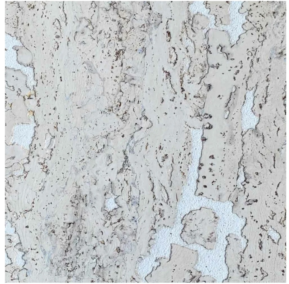 Un modèle élégant de papier peint en liège se compose de trois couches : celle du bas est en liège aggloméré, celle du milieu fait saillie en placage de liège et une couche protectrice de cire est appliquée sur le dessus du produit.