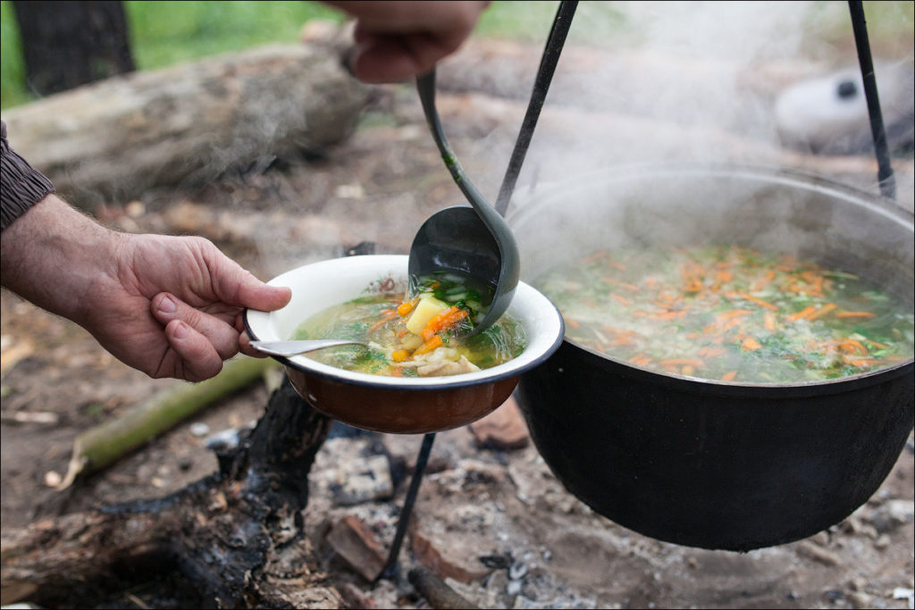 La version classique d'un dîner prêt à l'emploi est une soupe et un plat d'accompagnement. Les soupes sont préparées de différentes manières, vous pouvez les acheter prêtes à l'emploi dans des sacs, ou vous pouvez les faire cuire à partir de produits frais sur un feu dans une casserole ou un chaudron. Ils peuvent être préparés à partir d'aliments en conserve (viande ou poisson), ou faire une soupe de légumes maigres. Vous pouvez choisir des options pour chaque personne individuellement.Un plat chaud aidera à restaurer la force, nourrira le corps pendant longtemps.