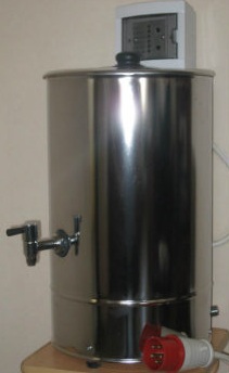Chaudière cylindrique. Les pièces en contact avec l'eau sont en métal résistant à la corrosion. Les supports sur les côtés du cadre, la partie inférieure de l'appareil et la poignée sur le couvercle, le robinet de vidange et les supports de thermomètre sont en plastique noir durable. Couvercle en verre avec trou vapeur. Le fond est équipé de petites pattes qui offrent une meilleure stabilité au produit. Il y a deux voyants lumineux, un interrupteur de température rotatif et un niveau de remplissage d'eau.
